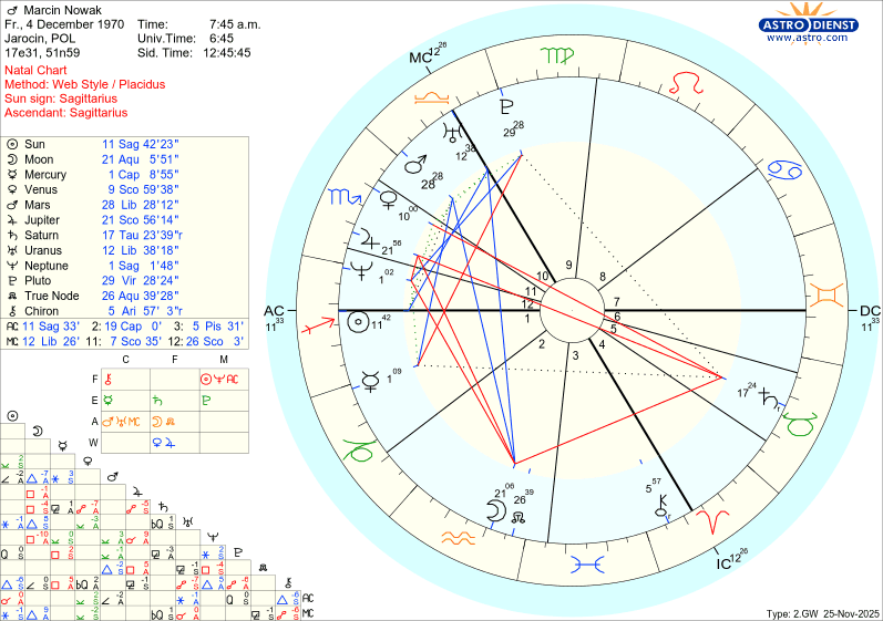 This birth chart report shows the positions of the planets for Marcin Nowak.